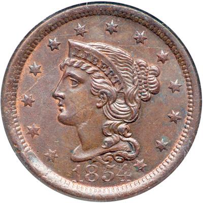 1854 N-19 R3. NGC graded MS-64 Brown. Lustrous light chocolate and bluish steel brown with generous traces of original mint red showing on both sides. Excellent eye appeal, just a hint of rub on the highest points from mint state. The notable marks are a very shallow low spot on the jaw (caused by debris on the die), a small nick in the dentils over the first T in STATES, and a tiny diagonal nick under the E in CENT. These marks are trivial but can help identify this cent. MDS, die state b, with the usually seen arcing die crack that crosses the upper part of the obverse. Our grade is AU58, CC#8 in the Grellman census. The attribution is noted on the NGC label.
