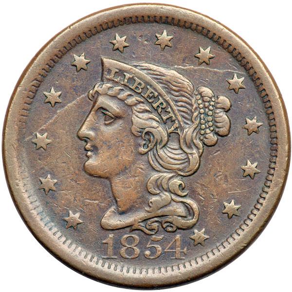1854 N-19 R3+ VF30. Glossy medium brown with reddish chocolate toning covering the protected areas. No spots, just a few minor contact marks, none notable. LDS, die state c. The obverse die crack is strong and the field above the crack is lower than the field below the crack. DWH #1519.