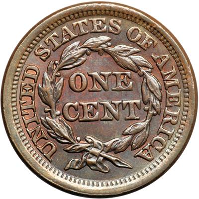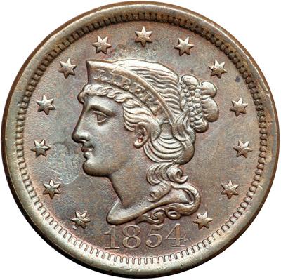 1854 N-2 R1. MS-60. Lustrous light olive and bluish steel brown with generous traces of mint color remaining on both sides. Satiny mint frost covers the planchet and this cent is choice except for a shallow low spot in the field off the chin and another under star 7. These were caused by debris stuck to the die. A speck of darker toning near the dentils above star 10 is the best identifying mark. MDS, die state b early. The die line across the bottom of the N in ONE is gone and the small lump over the left top of the N in CENT is barely visible.