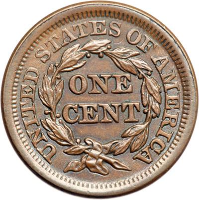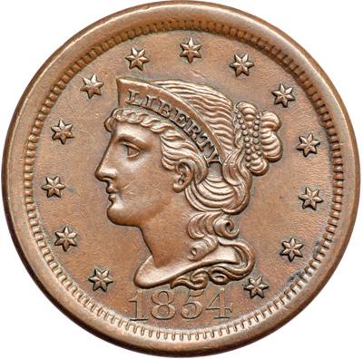 1854 N-21 R2. AU-55. Repunched 185. Choice lustrous chocolate brown. Outstanding eye appeal, virtually flawless in every respect. A faint spot of very fine carbon just right of star 3 is the best identifying mark. LDS, die state c. The repunching under the 185 is faint but remains visible, strongest under the base of the 1.