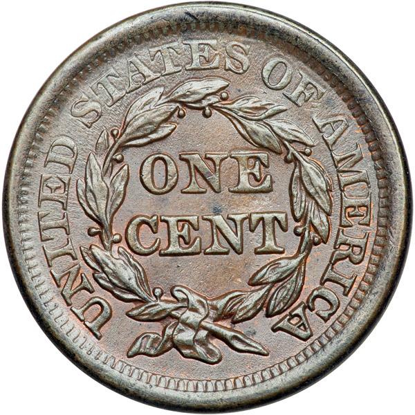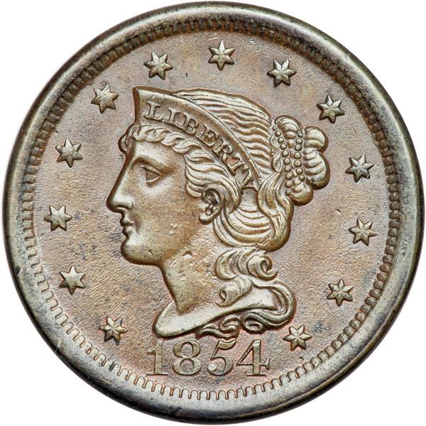1854 N-23 R2 AU58. Mint state sharpness with a very faint scuff of hairlines across the jaw and cheek. Lustrous chocolate and steel brown with traces of mellowed mint color remaining, especially on the reverse. There are several small wisps of darker olive toning on the lower half of the obverse, mostly on the rim. M-LDS, die state b.