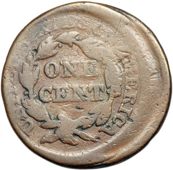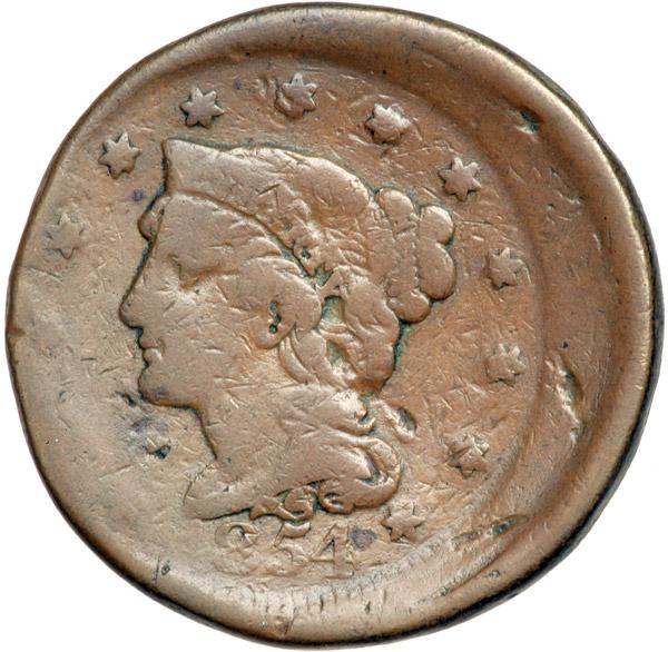 1854 N-23 R2 G5. Off Center. A bit sharper but there are some dull contact marks on the obverse, including one in the field just right of the inner curl plus a couple more on the unstruck area at the right side of the obverse. Glossy medium brown and chocolate. The date and legends are all readable, although a couple areas are relatively weak due to the uneven strike. Struck 20% off center to K-9. DWH #2489.
