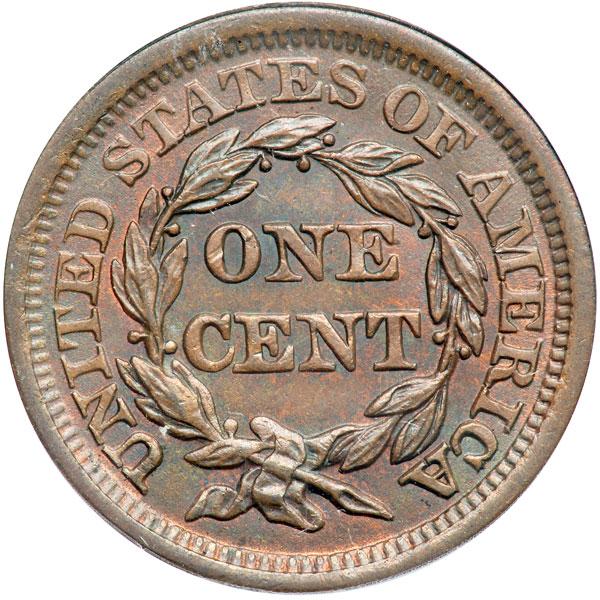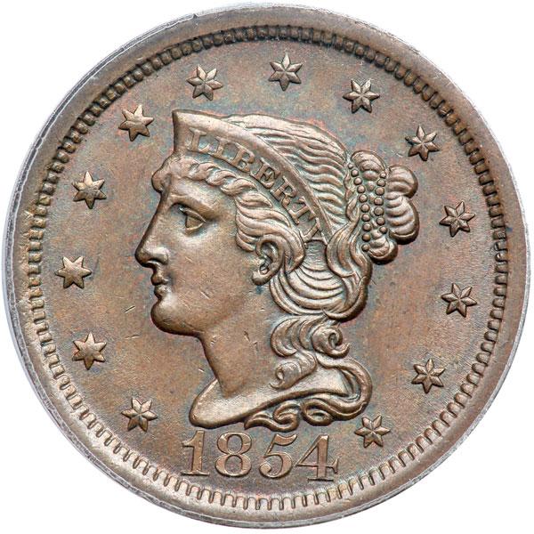 1854 N-24 R2+. PCGS graded MS-64 Brown. Lustrous light olive and bluish steel brown with traces of mint color in protected areas, mostly on the reverse. A small carbon spot close under the earlobe and several tiny ticks and planchet chips on the neck and in the field off the chin, plus a dull diagonal nick across the O in ONE are the notable marks, none distracting. The fields are frosty and the eye appeal of this cent is excellent. LDS, die state b. The fine die lines are gone and a die crack connects ME to the dentils over the adjacent A. Called MS60 and tied for CC#6 in the Noyes census, his photo #55158. Our grade is MS60, tied for CC#6 in the Grellman census. DWH #3594 (PCGS # 406124) .