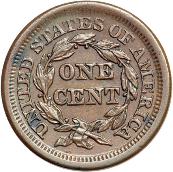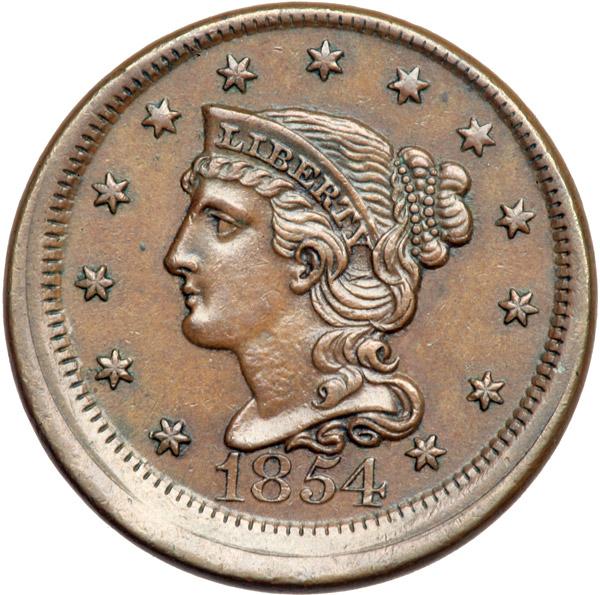 1854 N-25 R3 EF45. Misaligned Dies. Choice glossy medium brown with some darker chocolate toning at UN and D in UNITED. Excellent eye appeal. E-MDS, die state b. Struck with the obverse die misaligned to K-1.5 while the reverse is properly centered. DWH #3349.