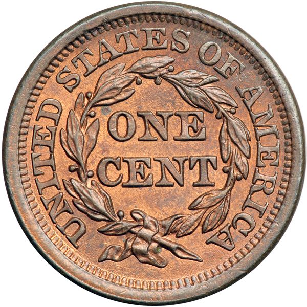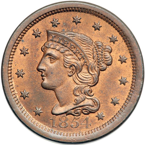 1854 N-26 R3+ MS63+. Lustrous mint red fading to steel brown and light olive with more than two-thirds of the mint color showing on both sides. Sharply struck offering great eye appeal for the grade, very close to MS64. Just a few trivial defects, including a horizontal nick at the throat, a tiny scuff just off the bust tip, a trio of very light nicks on the rim under the 54, and a small spot of dark toning over the O in ONE. MDS, die state a. The fields are covered with extremely fine flowlines but all the tiny lines and points of the early state remain visible. (There is no state b for this variety as the die marriage ended before any significant changes occurred to either of the dies.) Tied for CC#2 in the Grellman census.