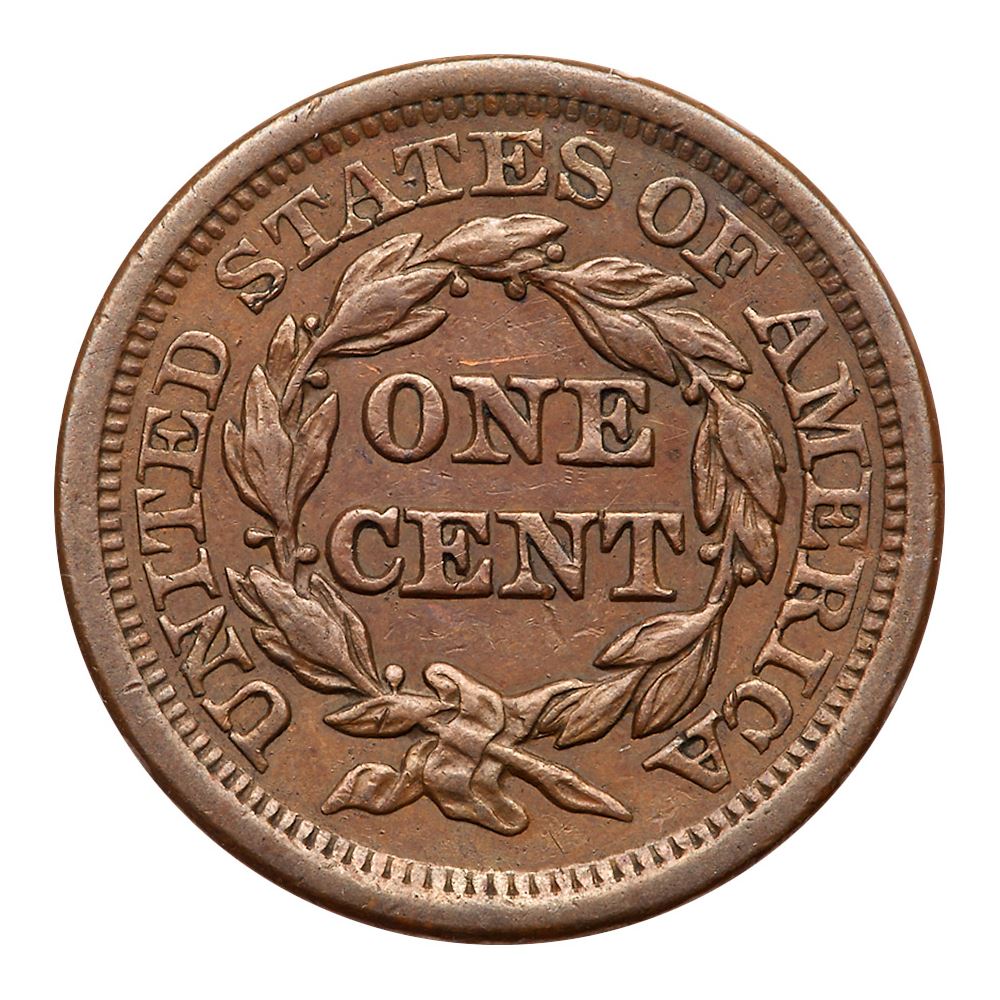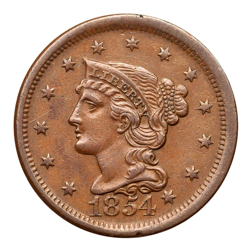 1854 N-28 R5- EF40. Attractive glossy medium brown and steel. The surfaces are smooth and the only notable mark is a tiny nick on the edge over star 7. MDS, die state b. A nice example of this tough variety. Estimated Value 200 - UP