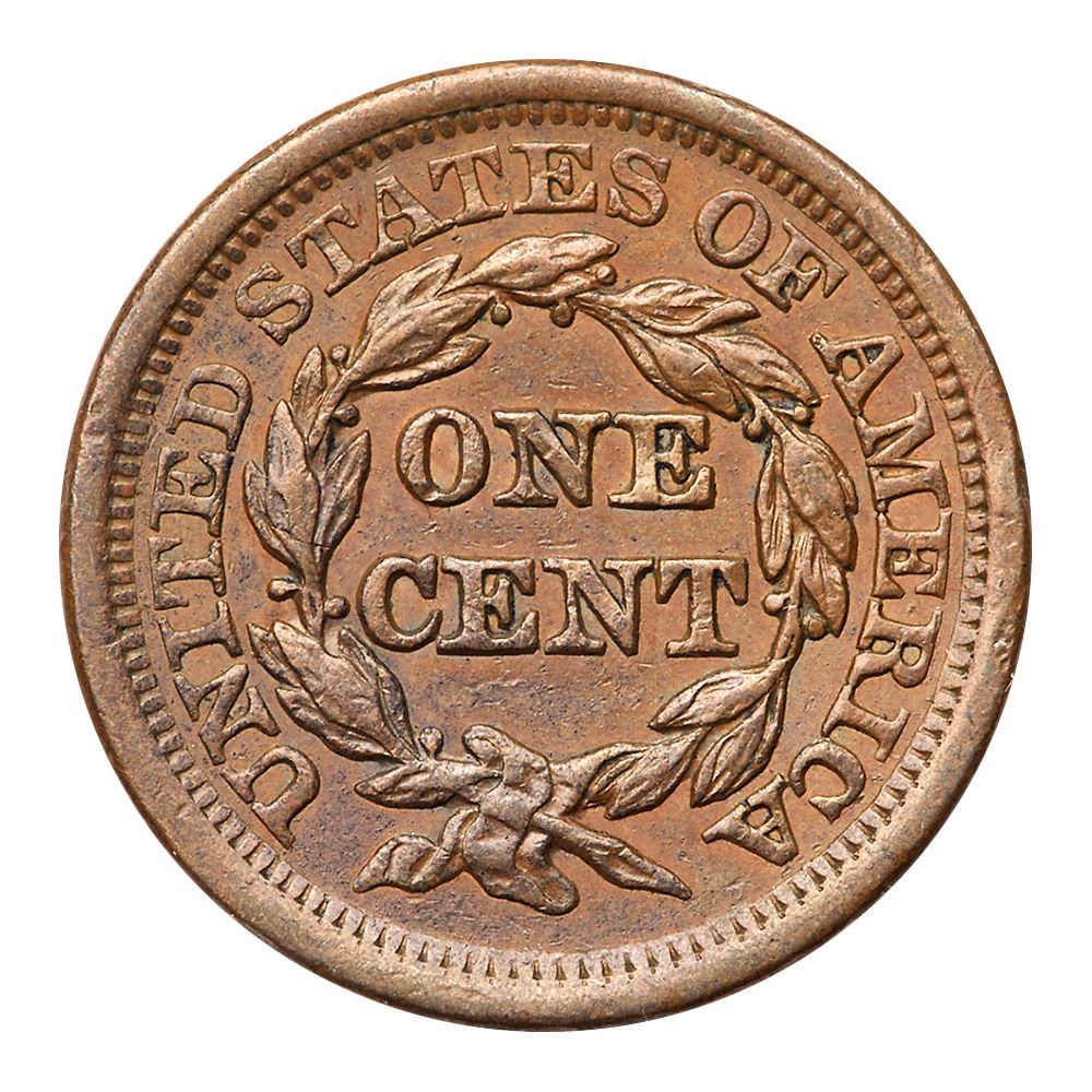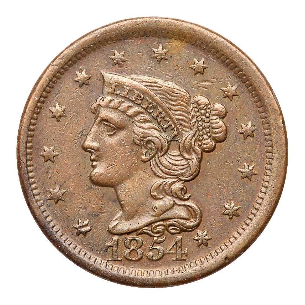 1854 N-28 R5- VF30+. Ten points sharper but there are too many small nicks for the higher grade. The only notable mark is a dull nick on the bust tip. Attractive glossy light olive brown. EDS, die state a. Estimated Value 125 - UP