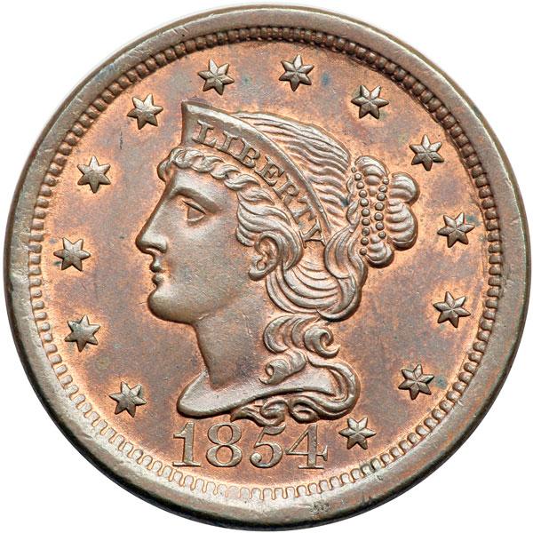1854 N-4 R2 Repunched 4 MS62+. Lustrous light bluish steel brown with 20% of the original mint color remaining on the obverse, 30% on the reverse. No spots or stains, just a few trivial marks from choice. These include a thin, very light nick in the center of the neck plus a tiny planchet void in the field under the left edge of star 5 and a few more on the rim under the 4 in the date, as struck. E-MDS, die state a. The fine repunching on the 4 and the delicate die clashmarks are clear. CC#2 behind a slightly finer example in the Grellman census. Removed from an NGC slab graded MS64BN (NGC label included, and it shows the attribution and Reiver provenance). DWH #3013.