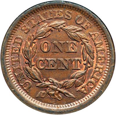 1854 N-6 R1 NGC graded MS65 Brown. NGC graded MS-65 Brown. Frosty steel and light chocolate brown with 5-10% of the mint red remaining, mostly on the reverse. Satiny and attractive, nearly choice except for a few tiny specks of darker toning scattered over the portrait and a dull contact mark on star 10 plus a similar mark near the dentils below that star. M-LDS, die state b late. There is a tiny lump close under the tip of the nose and the die lines at the dentils near star 2 are faint but still visible. Our grade is MS60+, tied for CC#3 of the die variety in the Grellman census. The attribution is noted on the NGC label.