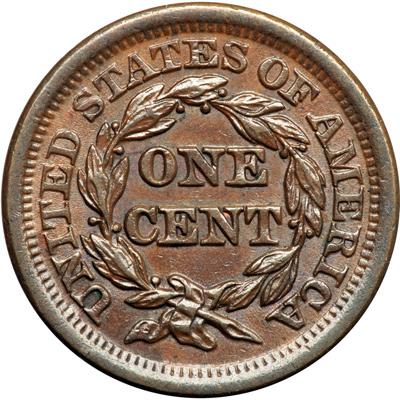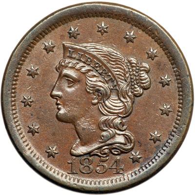 1854 N-9 R2. AU-50. The so-called Dartboard Obverse variety. Choice glossy chocolate and steel brown with satiny mint luster covering the fields and protected areas on both sides. A couple tiny peeps of mint color can be found on the reverse. A faint splash of darker chocolate toning near the dentils at stars 12-13 is the only notable mark. Great eye appeal for the grade. MDS, die state c early. A very shallow low spot covers the upper part of the neck, which is typical for this variety, and a fine die flowline reaches from the left end of the base of the 1 to a space between dentils below. The 1 punched into the right side of the ear is obvious and part of the 8 is visible right of the Y.