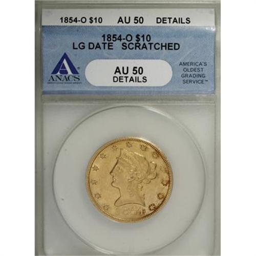 <B>1854-O $10 Large Date--Scratched--ANACS. AU50 Details. </B></I>NGC Census: (9/111). PCGS Population (17/37). Numismedia Wsl. Price for NGC/PCGS coin in AU50: $1,200. (#98614)<BR><BR><b>Shipping:</b> Coins & Currency (<a target="_blank" href="http://www.heritageauctions.com/common/shipping.php">view shipping information</a>)