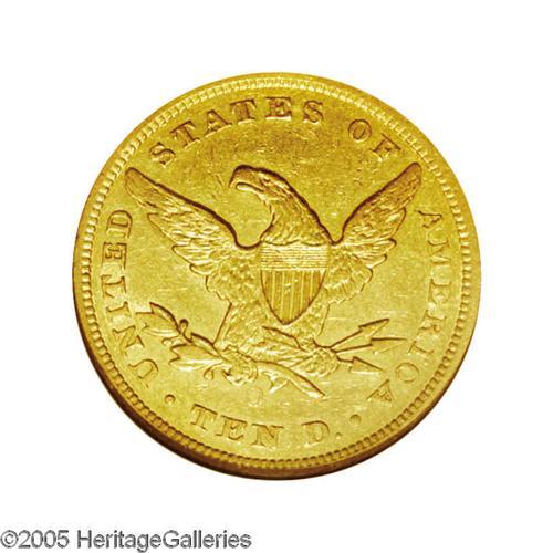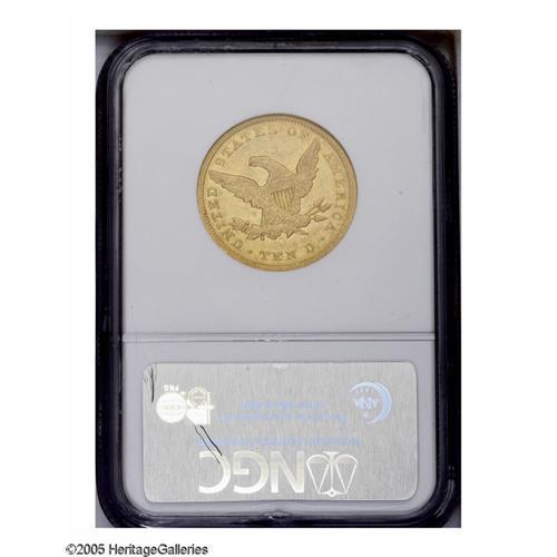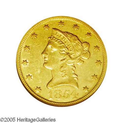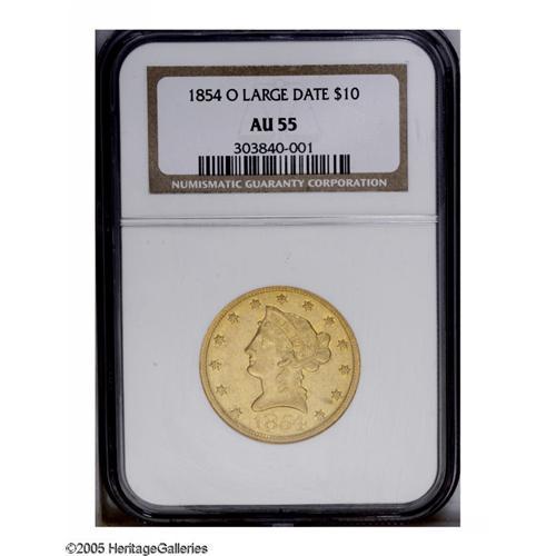 <B>1854-O<$10> Large Date AU55 NGC.</B></I> Prooflike luster still emanates from the protected areas around the devices on this lovely example. The color is copper-gold, and there are few mentionable distractions noted under a glass. A well struck and ultimately pleasing coin. Census: 31 in 55, 51 finer (12/05).
