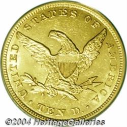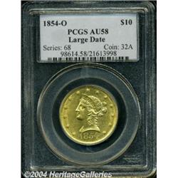 <B>1854-O<$10> Large Date AU58 PCGS.</B></I> This is the rare Large Date variety, which Walter Breen stated is unknown in Mint State, although a very small number of such coins have been identified since his <I>Complete Encyclopedia</B></I> was published in 1988. This example has bold central details with weak star lines on the obverse. The fields are highly lustrous with greenish-gold coloration. Only a few minute abrasions are visible. <BR><BR><B>Important notice:</B> Heritage usually auctions material at the rate of 200-250 lots per hour. On some occasions eBay Live bid software or the Internet may not be able to keep up with the pace of the auction. We recommend placing a realistic absentee bid now as insurance to avoid disappointment. Occasionally the auctioneer may eliminate or reject an eBay Live bid, and the auctioneer may also reopen a lot after the close of the eBay live bidding (usually because we missed an audience bid), and may reject your bid even if it shows you as the winning bidder. By bidding via eBay Live, you agree that Heritage may award the lot to another bidder at its sole discretion under the circumstances described above or any other reasonable circumstances. Since eBay bids are not shown to us until we open the lot on the floor, we treat those bids just like floor bids. In most cases the floor responds before the eBay bid is presented to us, due to Internet lag time, so for consistency we have made it a policy that floor bids are always considered first over tie eBay live bids. Also please note that all Heritage lots purchased through eBay Live carry a 20% Buyer's Premium. Please make sure you read the Terms and Conditions before you bid. </span></font></tr></table></td></tr></table>