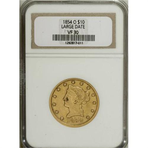 <B>1854-O $10 Large Date VF30 NGC.</B></I> NGC Census: (1/139). PCGS Population (1/68). (#98614)<BR><BR><b>Shipping:</b> Coins & Currency (<a target="_blank" href="http://www.heritageauctions.com/common/shipping.php">view shipping information</a>)