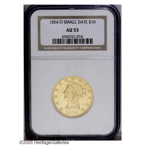 <B>1854-O<$10> Small Date AU53 NGC.</B></I> Bright mint luster individually outlines the stars, and fills the reverse legends and devices. This suitably struck example has light abrasions near the base of the mintmark, but is not unduly marked for a briefly circulated large denomination gold piece.