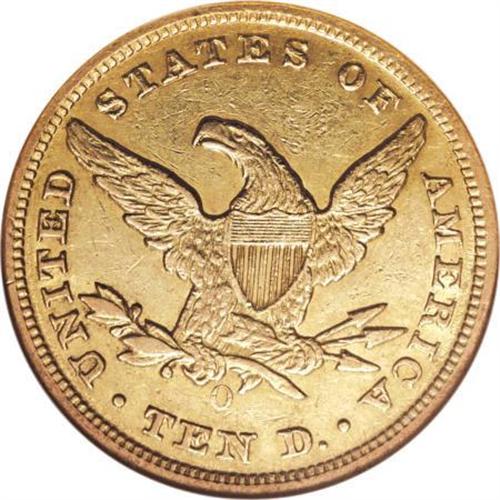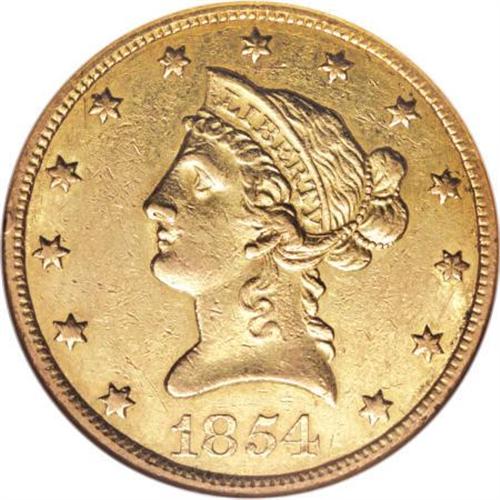 <B>1854-O $10 Small Date AU55 NGC.</B></I> Incorrectly designated as a Large Date on the NGC holder. Breen believed the Large Date was rarer, but Heritage auction records demonstrate there is only marginal difference in rarity between the two logotypes, which are identically priced in the 2008 <I>Guide Book</B></I>. Both varieties are scarce, since the combined mintage is just 52,500 pieces. This partly lustrous example lacks mentionable marks, and has an interesting die break within the hair above the ear.<BR><BR><B>Coin Engraver:</B> Christian Gobrecht<BR><BR><b>Shipping:</b> Coins & Currency (<a target="_blank" href="http://www.heritageauctions.com/common/shipping.php">view shipping information</a>)