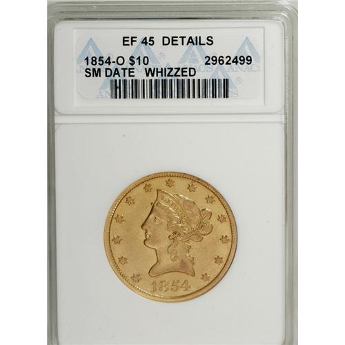 <B>1854-O $10 Small Date--Whizzed--ANACS. XF45 Details.</B></I> NGC Census: (44/132). PCGS Population (26/57). Mintage: 52,500. Numismedia Wsl. Price: $826. (#8614)<BR><BR><b>Shipping:</b> Coins & Currency (<a target="_blank" href="http://www.heritageauctions.com/common/shipping.php">view shipping information</a>)