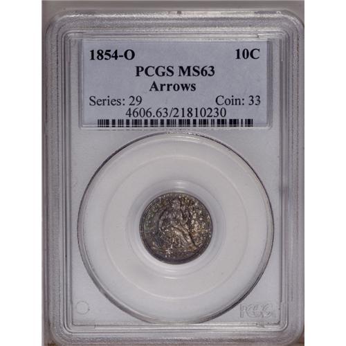 <B>1854-O 10C Arrows MS63 PCGS.</B></I> An amazing example with variegated toning on the obverse and essentially brilliant satin luster on the reverse. The obverse has heavy clash marks and the reverse die is shattered. Extremely large arrowheads for a coin of dime size, the upper barbs merged with the base of Liberty, and the points joined to the border denticles.