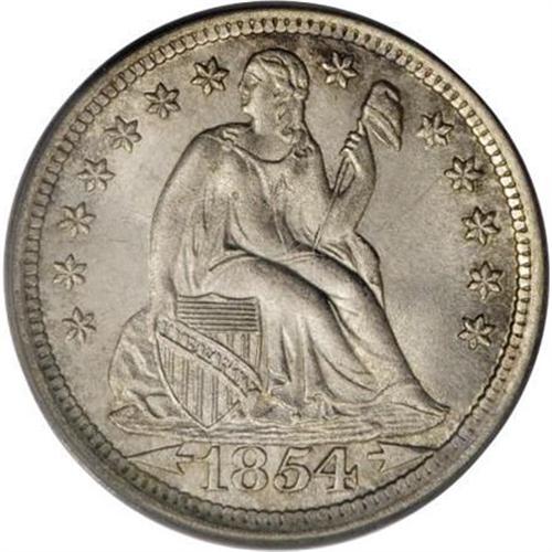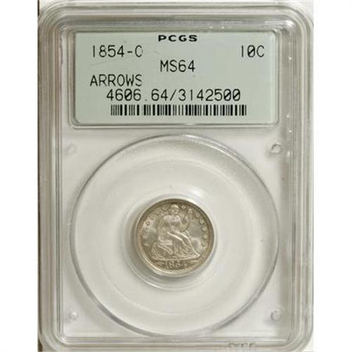 <B>1854-O 10C Arrows MS64 PCGS.</B></I> A lustrous example of this short-lived variety that has pleasing dove-gray patina over each side. Well struck save for the lower obverse dentils, and the matte-like surfaces have only a few nearly imperceptible hairlines. Housed in an old green label holder. Population: 13 in 64, 8 finer (8/07).<I><BR>From The Beau Clerc Collection.</B></I><BR><BR><B>Coin Engraver:</B> Christian Gobrecht<BR><BR><b>Shipping:</b> Coins & Currency (<a target="_blank" href="http://www.heritageauctions.com/common/shipping.php">view shipping information</a>)
