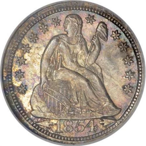 <B>1854-O 10C Arrows MS65 NGC.</B></I> Though the 1854-O Arrows dime is slightly more available than its 1853-O counterpart, it remains highly elusive, particularly in Gem. This remarkable piece offers soft, pleasing luster and elegant gold and violet patina over each side. Carefully preserved, pleasingly detailed, and undeniably appealing. Census: 9 in 65, 9 finer (3/08).<BR><BR><B>Coin Engraver:</B> Christian Gobrecht<BR><BR><b>Shipping:</b> Coins & Currency (<a target="_blank" href="http://www.heritageauctions.com/common/shipping.php">view shipping information</a>)