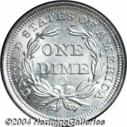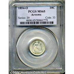 <B>1854-O<10C> Arrows MS65 PCGS.</B></I> A splendid Gem Seated dime with brilliant, frosty surfaces and only miniscule abrasions. The strike is razor sharp, and the overall appearance is fantastic. Arrows were added to the dates of all silver coins (except Trimes) in 1853 to signify a change in the weight of silver contained in each. These arrows only lasted through 1855, and thus this short-lived type is always popular. This piece will thrill both dime specialists and type collectors alike. Population: 5 in 65, 0 finer (7/04). <BR><BR><B>Important notice:</B> Heritage usually auctions material at the rate of 200-250 lots per hour. On some occasions eBay Live bid software or the Internet may not be able to keep up with the pace of the auction. We recommend placing a realistic absentee bid now as insurance to avoid disappointment. Occasionally the auctioneer may eliminate or reject an eBay Live bid, and the auctioneer may also reopen a lot after the close of the eBay live bidding (usually because we missed an audience bid), and may reject your bid even if it shows you as the winning bidder. By bidding via eBay Live, you agree that Heritage may award the lot to another bidder at its sole discretion under the circumstances described above or any other reasonable circumstances. Since eBay bids are not shown to us until we open the lot on the floor, we treat those bids just like floor bids. In most cases the floor responds before the eBay bid is presented to us, due to Internet lag time, so for consistency we have made it a policy that floor bids are always considered first over tie eBay live bids. Also please note that all Heritage lots purchased through eBay Live carry a 20% Buyer's Premium. Please make sure you read the Terms and Conditions before you bid. </span></font></tr></table></td></tr></table>