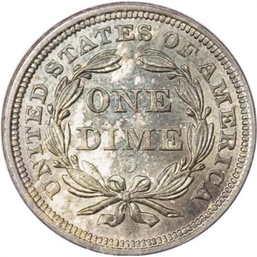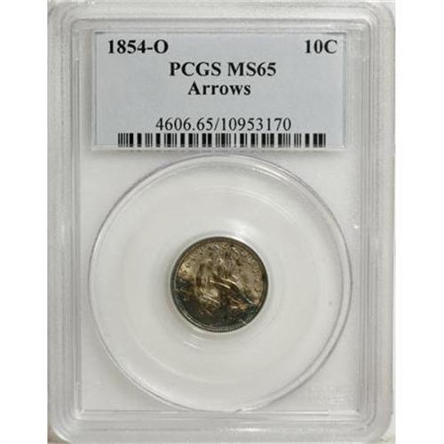 <B>1854-O 10C Arrows MS65 PCGS.</B></I> Although production of this second year Arrows O-mint approached 1.8 million pieces, Mint State survivors are several times scarcer than their Philadelphia counterpart. This unusually well preserved example displays splashes of turquoise and russet toning on each side. A series of die cracks about the obverse periphery culminates in a heavy break connecting the 1 in the date to the left arrow. Population: 8 in 65, 0 finer (7/07).<BR><BR><B>Coin Engraver:</B> Christian Gobrecht<BR><BR><b>Shipping:</b> Coins & Currency (<a target="_blank" href="http://www.heritageauctions.com/common/shipping.php">view shipping information</a>\)