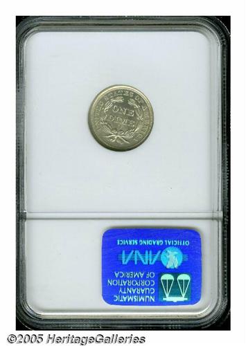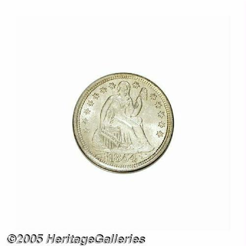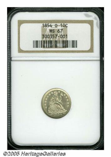 <B>1854-O<10C> Arrows MS67 NGC.</B></I> The highly lustrous surfaces are remarkable for their sharpness of strike and virtual lack of abrasions. The texture is a pleasing mixture of frosty and satiny qualities likely caused by slightly rusted dies. This result was not uncommon on coins produced by the New Orleans Mint, where high humidity played havoc with any dies stored without grease for even a brief time. At certain angles, this coin appears brilliant, at others, delicate golden overtones are visible. The 1854-O is not an absolute rarity, but precious few examples have been preserved above the MS 64 grade level. In addition, this issue is one of only five deliveries of the 1853-55 Arrows type. An important bidding opportunity for the Superb Gem type collector. The combined NGC and PCGS Population Reports note that a total of three coins have been graded this high, with none seen finer.