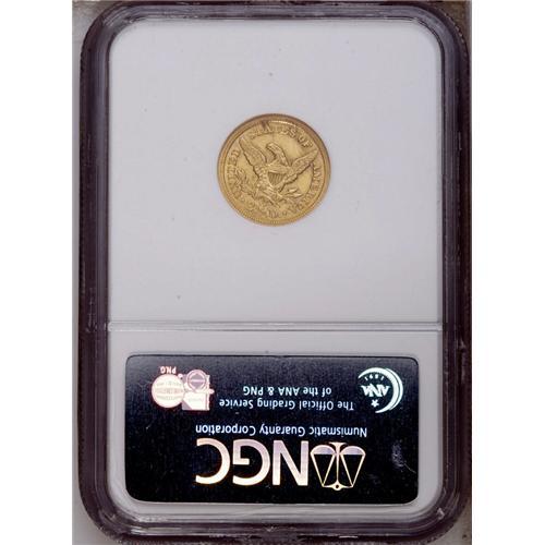 <B>1854-O $2 1/2 AU58 NGC.</B></I> A smooth honey-gold piece with substantial luster throughout the peripheries and devices. The eagle's shield shows the usual slight incompleteness of strike. A couple of light planchet streaks (as made) are noted on the upper reverse.