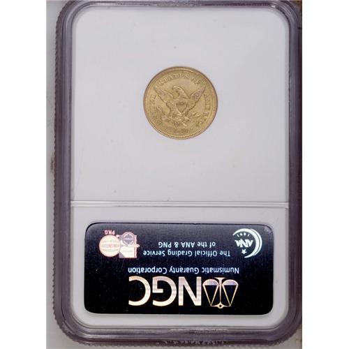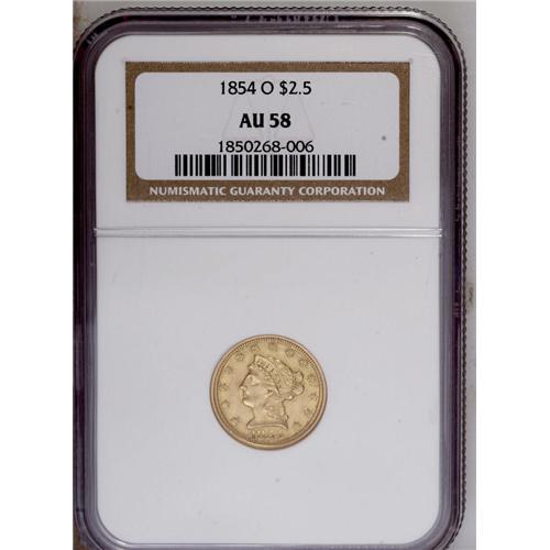 <B>1854-O<$2 1/2> AU58 NGC.</B></I> A trace of highpoint friction appears on the obverse. The yellow-orange surfaces retain most of their original luster and have only a few small marks.