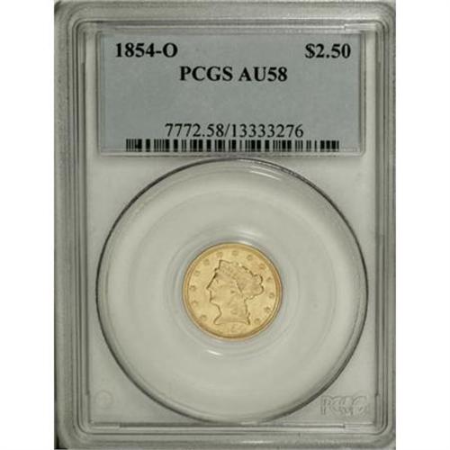 <B>1854-O $2 1/2 AU58 PCGS.</B></I> Lots of satiny mint luster remains on this lightly circulated, but popular New Orleans issue. The light straw-gold surfaces are typically struck for the issue, with some softness of details in the centers.<BR><BR><B>Coin Engraver:</B> Christian Gobrecht<BR><BR><b>Shipping:</b> Coins & Currency (<a target="_blank" href="http://www.heritageauctions.com/common/shipping.php">view shipping information</a>)