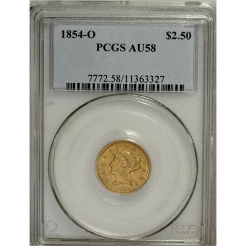 <B>1854-O $2 1/2 AU58 PCGS.</B></I> A pleasing near-Mint example with uniformly struck design elements. Yellow-gold surfaces display whispers of mint-green, and retain ample luster. Minimally abraded for a lightly circulated coin. Population: 22 in 58, 18 finer (3/08).<BR><BR><B>Coin Engraver:</B> Christian Gobrecht<BR><BR><b>Shipping:</b> Coins & Currency (<a target="_blank" href="http://www.heritageauctions.com/common/shipping.php">view shipping information</a>)
