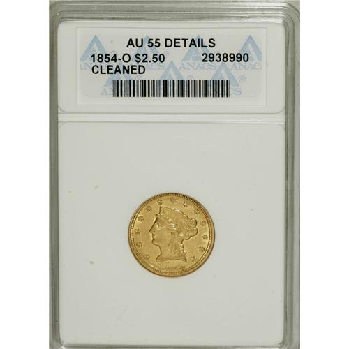 <B>1854-O $2 1/2 --Cleaned--ANACS. AU55 Details.</B></I> NGC Census: (79/147). PCGS Population (0/0). Mintage: 153,000. Numismedia Wsl. Price for NGC/PCGS coin in AU55: $565. (#7772)<BR><BR><b>Shipping:</b> Coins & Currency (<a target="_blank" href="http://www.heritageauctions.com/common/shipping.php">view shipping information</a>)