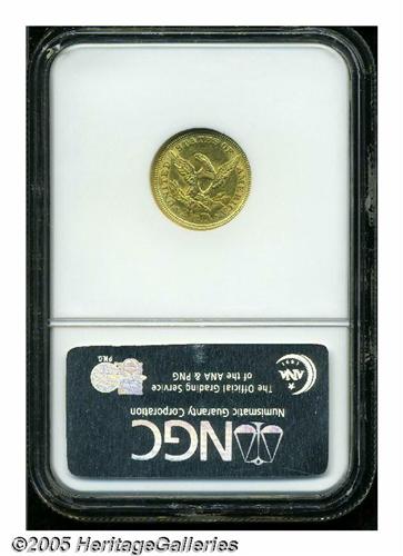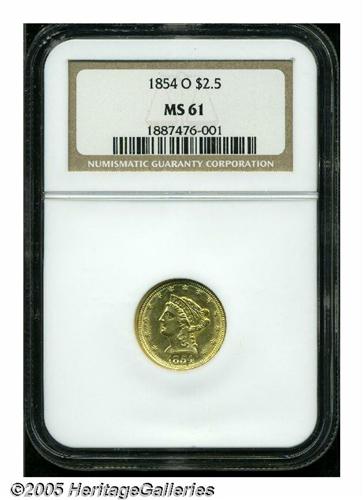 <B>1854-O<$2 1/2> MS61 NGC.</B></I> Bright yellow-gold surfaces are nicely struck for this well produced New Orleans issue, displaying just a touch of softness on the eagle's neck and left (facing) leg. Despite a healthy (153,000 pieces) mintage and reputation as a rather common O-mint Quarter Eagle, true Mint State pieces are quite scarce. Population: 10 in 61, 8 finer (3/05).