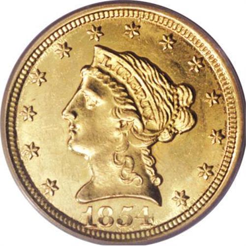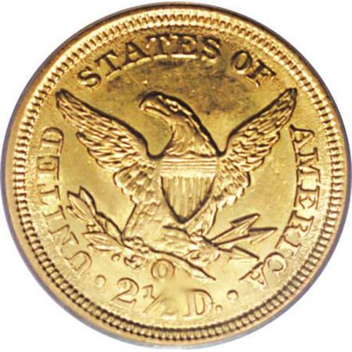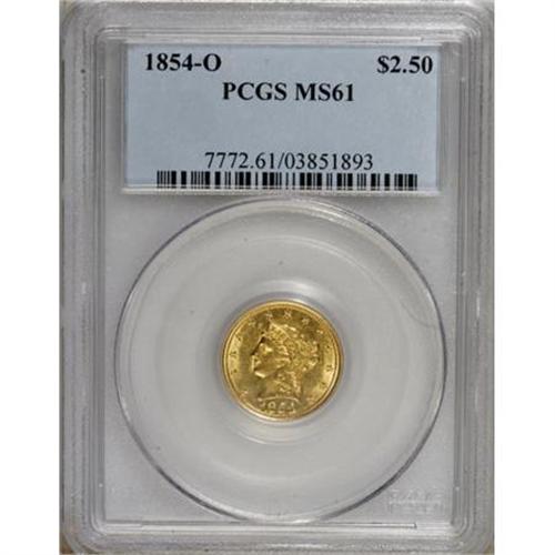 <B>1854-O $2 1/2 MS61 PCGS.</B></I> A pleasantly unabraded example with flashy fields and lustrous borders. Well struck aside from the centers, which show only minor weakness. The mintmark was deeply entered, and its relief is much greater than the denomination beneath it. Although XF and AU examples are relatively available, the 1854-O is rare in Mint State. Population: 4 in 61, 10 finer (6/07).<BR><BR><B>Coin Engraver:</B> Christian Gobrecht<BR><BR><b>Shipping:</b> Coins & Currency (<a target="_blank" href="http://www.heritageauctions.com/common/shipping.php">view shipping information</a>\)