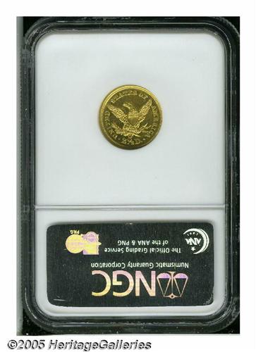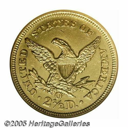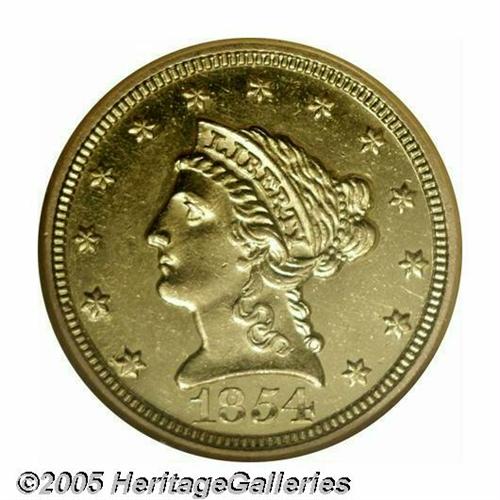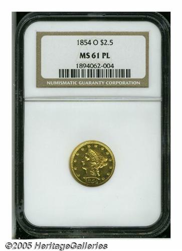 <B>1854-O<$2 1/2> MS61 PL NGC.</B></I> Despite the fact that this is one of the more plentiful New Orleans Mint gold coins in higher grades, true Mint State examples are extremely difficult to locate. Doug Winter summed up the situation with this date: "The 1854-O has the second highest mintage figure of any quarter eagle struck at the New Orleans Mint. It is one of the more common issues within this series, but it is still far from being the 'common' date which most pricing guides purport it to be." Only about a dozen MS60 or finer coins exist. That offered here is sharply struck and even has full details on the eagle's right leg. It is fully prooflike with reflective mirrored fields. The surfaces have greenish-gold luster.