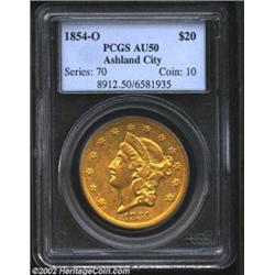 1854-O $20 AU50 PCGS. One date in this long-lived series is both the second rarest O-mint Double Eagle and the third rarest Type One Double Eagle. Those two laurels belong to the 1854-O. After a high of 315,000 pieces produced in 1851, O-mint Double Eagle production fell each succeeding year until a temporary low of only 3,250 pieces was reached in 1854. All survivors of the 1854-O delivery, and there are no more than 35 coins, are identifiable by obverse die file marks (as produced) at the TY in LIBERTY. Since no Mint State 1854-O Double Eagles are extant, the 5-7 About Uncirculated survivors all qualify for Condition Census standing. According to our records, the following examples are the only certified AU representatives to appear at auction over the past decade: 1. Ex: January 31-February 2, 1993 Auction (Superior, 1-2/1993), lot 1484, where it realized $39,600. Certified AU50 by PCGS. 2. Ex: California Sale (Goldbergs, 10/2000), lot 1142, where it realized $81,650. Also certified AU50 by PCGS. 3. Ex: Harry W. Bass, Jr. Collection (Bowers and Merena, 5/2000), lot 780, where it realized $103,500. An AU55 PCGS example. 4. Ex: FUN Signature Sale--The Eagle Collection (Heritage, 1/2002), lot 4011, where it realized $92,000. Certified AU58 by NGC.We have been unable to trace the pedigree of the present example, but future catalogers should note that there is an identifying scrape on the obverse over the right center of the 8 in the date. One will need a loupe to discern that feature. The balance of the abrasions are either small or moderate in size, but none are individually conspicuous. Sharply struck with light, evenly distributed wear, the surfaces are colored in rich olive-gold and orange-gold shades. Traces of the original prooflike finish are still evident in many of the more protected areas around the devices. Perhaps the most important O-mint coin in this collection, this '54-O Double Eagle is certain to elicit strong bids from dedicated Southern gold collectors.From the Ashland City Collection. Important notice: We expect to be auctioning lots at the rate of 200-250 per hour. Sometimes eBay Premier live bid software cannot keep up with that pace, so we strongly recommend that you place a realistic proxy bid now as insurance to avoid disappointment. Also please note that all Heritage/CAA lots purchased through eBay Premier carry a 20% Buyer's Premium. Please make sure you read the Terms and Conditions.