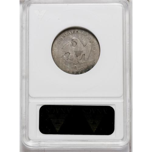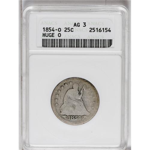<B>1854-O<25C> Huge O AG3 ANACS.</B></I> FS-004. Briggs 1-A. Specialists believe that the crude, oversized, donut-shaped mintmark was hand-engraved onto a working die at New Orleans. Dies were made at Philadelphia, and apparently a worker there neglected to punch the mintmark into the die before it was shipped to the Southern facility. Portions of the reverse peripheral legends are worn into the rim, but the mintmark is clear.
