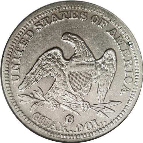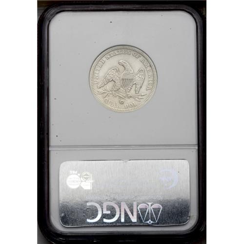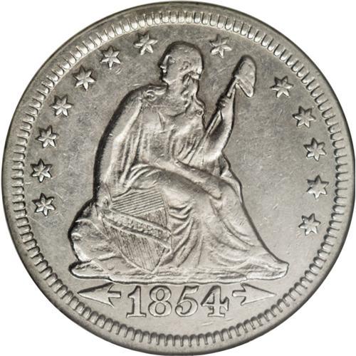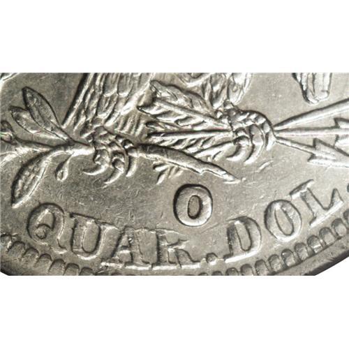 <B>1854-O<25C> Huge O AU55 NGC.</B></I> FS-004. Briggs 1-A, the only die pairing. This distinctive variety was created (most likely) when a die was shipped to New Orleans without a mintmark, and the O was engraved in the die by hand. Very scarce above XF, this piece shows even wear over the highpoints with a silver-gray appearance overall. This is the finest Huge O example we have had the opportunity to offer, and easily qualifies for the Condition Census of this interesting variety. Census: 1 in 55, 1 finer (2/06).