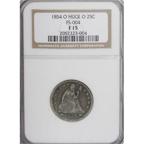 <B>1854-O 25C Huge O Fine 15 NGC.</B></I> FS-004. Briggs 1-A, the only die pairing of this variety. A collectible example of this rare issue showing the large donut-shaped mintmark believed to have been hand engraved into the working die. The devices are slate-gray and contrast mildly with the mildly granular lavender-gray fields.<BR><I>Ex: FUN Signature (Heritage, 1/05), lot 6388.</B></I><BR><BR><B>Coin Engraver:</B> Christian Gobrecht<BR><BR><b>Shipping:</b> Coins & Currency (<a target="_blank" href="http://www.heritageauctions.com/common/shipping.php">view shipping information</a>\)