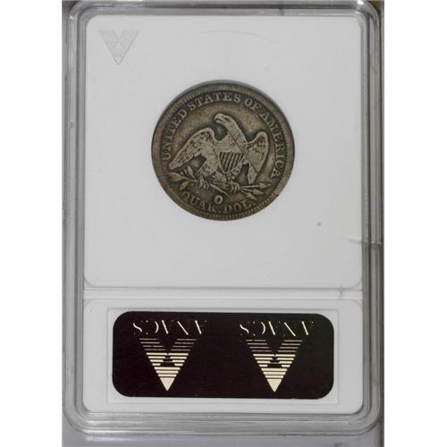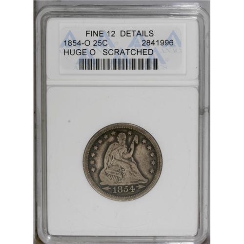 <B>1854-O<25C> Huge O--Scratched--ANACS. Fine 12 Details.</B></I> Typical grade for this dramatic mintmark variant, speculated to have been engraved by hand when a shipped die was lacking a mintmark. Pleasing natural gray color and full LIBERTY, but hampered by a scratch across the eagle.
