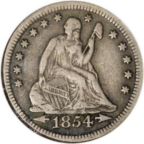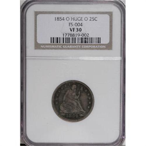 <B>1854-O 25C Huge O VF30 NGC.</B></I> FS-501, formerly FS-004. According to <I>Cherrypickers'</B></I>, this popular Guide Book variety features a "very large, extremely thick ... and most irregular" New Orleans mintmark. Likely, the mintmark was engraved by hand onto the reverse die, similar to what was done for various rare 1870-S denominations. A nicely defined lavender-gray representative with a hint of verdigris in design recesses. Census: 2 in 30, 8 finer (11/07).<BR><BR><B>Coin Engraver:</B> Christian Gobrecht<BR><BR><b>Shipping:</b> Coins & Currency (<a target="_blank" href="http://www.heritageauctions.com/common/shipping.php">view shipping information</a>)