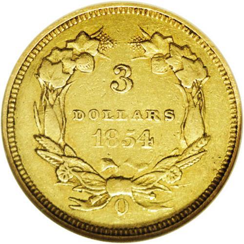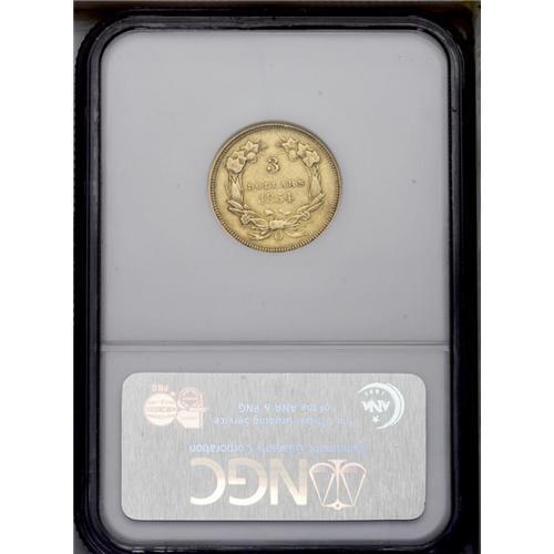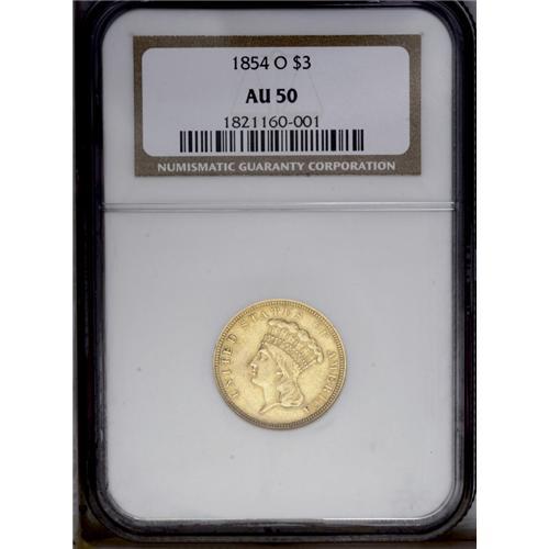 <B>1854-O<$3> AU50 NGC.</B></I> Light green-gold color with splashes of orange toning. The surfaces are lightly abraded as usual. The devices on both sides exhibit light wear. A pleasing example for the budget-minded collector. <BR><BR><B>Important notice:</B> Heritage usually auctions material at the rate of 200-250 lots per hour. On some occasions eBay Live bid software or the Internet may not be able to keep up with the pace of the auction. We recommend placing a realistic absentee bid now as insurance to avoid disappointment. Occasionally the auctioneer may eliminate or reject an eBay Live bid, and the auctioneer may also reopen a lot after the close of the eBay live bidding (usually because we missed an audience bid), and may reject your bid even if it shows you as the winning bidder. By bidding via eBay Live, you agree that Heritage may award the lot to another bidder at its sole discretion under the circumstances described above or any other reasonable circumstances. Since eBay bids are not shown to us until we open the lot on the floor, we treat those bids just like floor bids. In most cases the floor responds before the eBay bid is presented to us, due to Internet lag time, so for consistency we have made it a policy that floor bids are always considered first over tie eBay live bids. Also please note that all Heritage lots purchased through eBay Live carry a 20% Buyer's Premium. Please make sure you read the Terms and Conditions before you bid. This lot is being auctioned in conjunction with a live floor auction by Heritage Galleries & Auctioneers. All final auction and invoice information will be supplied by Heritage Galleries & Auctioneers, and all other information should be considered preliminary. Lot:2558 <BR><BR><B>Winning Notification and Billing:</B> After the FINAL session in this auction is complete, Heritage will send e-mail and snail mail invoices. This process normally takes several days. All final auction and invoice information will be supplied by Heritage Galleries & Auctioneers, and all other information should be considered preliminary. <BR><BR>This auction will be conducted on a live auction floor and over the Internet through eBay Live. If you choose to place an absentee bid, please take a moment to <font color='#0000ff'><u><a href='http://pages.ebay.com/liveauctions/help/before/laabsentee.html'>learn how eBay Live absentee bidding works</a></u></font><font color='#000000'>