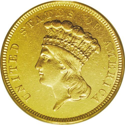 <B>1854-O<$3> AU50 PCGS.</B></I> First year of issue and the only year the New Orleans mint produced a three dollar gold piece. These factors make this a highly collectible issue, even though it is not an absolute rarity. The surfaces on this piece are very bright and each side displays green-gold coloration. Each side is peppered with numerous small abrasions, but none are worthy of individual mention.