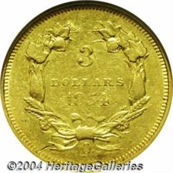 <table><tr><td><table><tr><td>1854-O $3 AU53 NGC. A bit softly struck, as one would expect from a New Orleans gold coin from this era, the surfaces are lightly abraded on each side. The (almost) diagnostic die crack through the mintmark is light on this piece but clearly discernible with a magnifier. The 1854-O is the only New Orleans mint issue for the three dollar gold piece, and its significance seems to us to have been largely overlooked by collectors. <BR><BR><B>Important notice:</B> Heritage usually auctions material at the rate of 200-250 lots per hour. On some occasions eBay Live bid software or the Internet may not be able to keep up with the pace of the auction. We recommend placing a realistic absentee bid now as insurance to avoid disappointment. Occasionally the auctioneer may eliminate or reject an eBay Live bid, and the auctioneer may also reopen a lot after the close of the eBay live bidding (usually because we missed an audience bid), and may reject your bid even if it shows you as the winning bidder. By bidding via eBay Live, you agree that Heritage may award the lot to another bidder at its sole discretion under the circumstances described above or any other reasonable circumstances. Since eBay bids are not shown to us until we open the lot on the floor, we treat those bids just like floor bids. In most cases the floor responds before the eBay bid is presented to us, due to Internet lag time, so for consistency we have made it a policy that floor bids are always considered first over tie eBay live bids. Also please note that all Heritage lots purchased through eBay Live carry a 20% Buyer's Premium. Please make sure you read the Terms and Conditions before you bid. <BR><BR><B>IMPORTANT ANNOUNCEMENT ABOUT RESERVES:</B> Heritage now divulges all reserves on its web site 7 days before every auction. If you want to know whether the reserve on this lot has been met, and if not, what the reserve amount is, please visit this lot page on the HeritageCoin.com web site, or email: bid@HeritageGalleries.com </span></font></td></tr></table></td></tr></table>