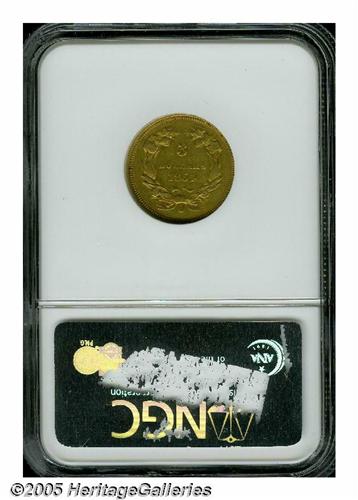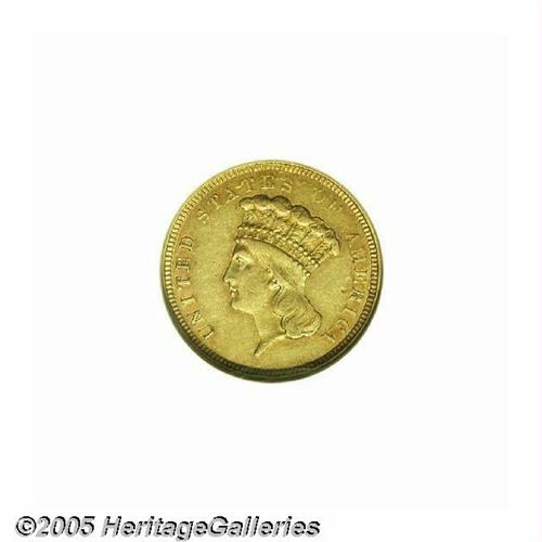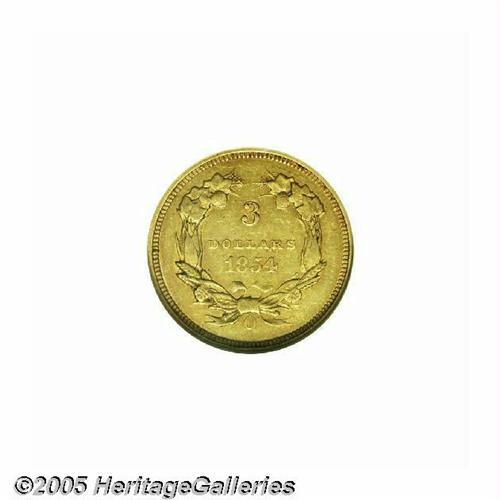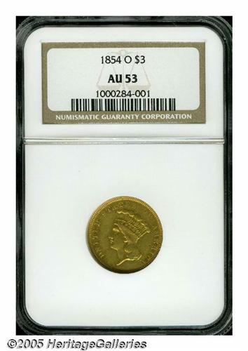 <B>1854-O<$3> AU53 NGC.</B></I> A scarce date with a mintage of only 24,000 pieces. This specimen displays bright orange patina in the recessed areas, and greenish-gold hues in the fields. With the exception of the bow ribbons, the design elements are of above average strike for the issue. A few minute marks occur on each side, but none are offensive. Very few issues of this denomination were produced at the branch mints, and this 1854 is the only date of the denomination struck in New Orleans. This is an important consideration for the collector of New Orleans Mint type coins.