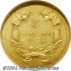 <table><tr><td><table><tr><td>1854-O $3 AU53 NGC. An average or better strike for this lone New Orleans Three Dollar issue, with coppery accents that cling to the devices and scattered contact marks. <BR><BR><B>Important notice:</B> Heritage usually auctions material at the rate of 200-250 lots per hour. On some occasions eBay Live bid software or the Internet may not be able to keep up with the pace of the auction. We recommend placing a realistic absentee bid now as insurance to avoid disappointment. Occasionally the auctioneer may eliminate or reject an eBay Live bid, and the auctioneer may also reopen a lot after the close of the eBay live bidding (usually because we missed an audience bid), and may reject your bid even if it shows you as the winning bidder. By bidding via eBay Live, you agree that Heritage may award the lot to another bidder at its sole discretion under the circumstances described above or any other reasonable circumstances. Since eBay bids are not shown to us until we open the lot on the floor, we treat those bids just like floor bids. In most cases the floor responds before the eBay bid is presented to us, due to Internet lag time, so for consistency we have made it a policy that floor bids are always considered first over tie eBay live bids. Also please note that all Heritage lots purchased through eBay Live carry a 20% Buyer's Premium. Please make sure you read the Terms and Conditions before you bid. <BR><BR><B>IMPORTANT ANNOUNCEMENT ABOUT RESERVES:</B> Heritage now divulges all reserves on its web site 7 days before every auction. If you want to know whether the reserve on this lot has been met, and if not, what the reserve amount is, please visit this lot page on the HeritageCoin.com web site, or email: bid@HeritageGalleries.com </span></font></td></tr></table></td></tr></table>