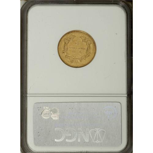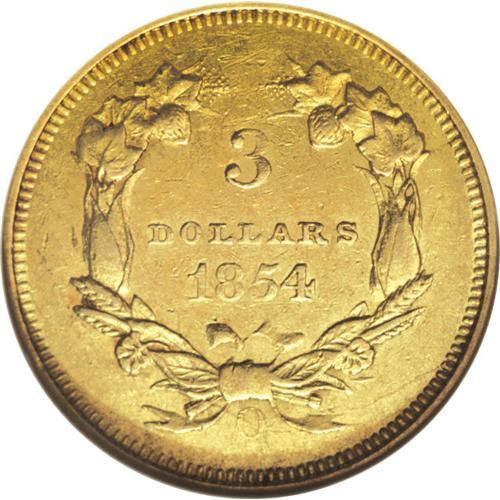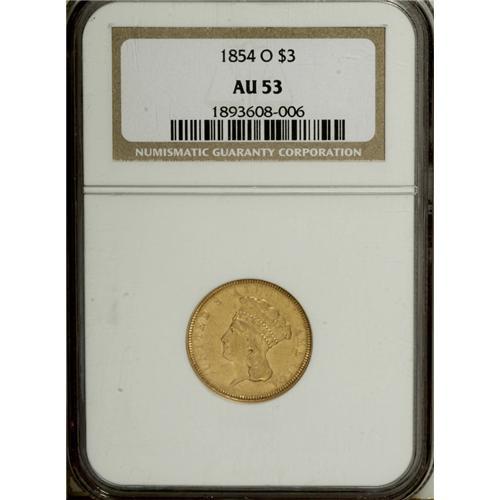 <B>1854-O $3 AU53 NGC.</B></I> Douglas Winter comments in <I>Gold Coins of the New Orleans Mint</B></I> concerning the 1854-O that "Most are well worn and show poor strikes. The majority have been cleaned and show unappealing color and dull luster." This coin shows a fairly typical strike for the issue, with weakness around several of the obverse peripheral letters, as well as on the reverse at 85 and the O mintmark. On the other hand, singular abrasions are few, and considerable luster is still present under the light field chatter noted on each side.<BR><BR><b>Shipping:</b> Coins & Currency (<a target="_blank" href="http://www.heritageauctions.com/common/shipping.php">view shipping information</a>)