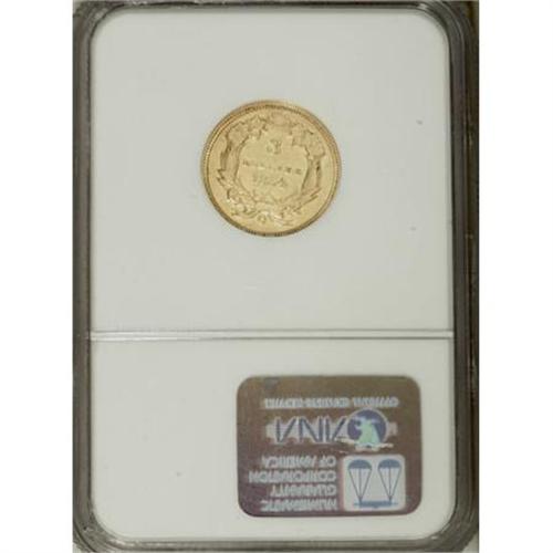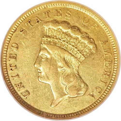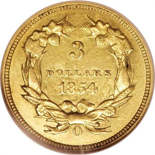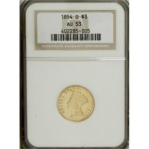 <B>1854-O $3 AU53 NGC.</B></I> The 1854-O three dollar gold is a popular (and essential) coin for collectors attempting to assemble a complete mintmarked set of this series. While there are numerous alternatives available for the P- and S-mint issues, for the Dahlonega and New Orleans coins, only the respective 1854 pieces will suffice. This example offers light yellow-gold surfaces with few visible distractions and good luster, although a few light ticks and scrapes appear under a loupe, attesting to a short spate in circulation.<BR><BR><b>Shipping:</b> Coins & Currency (<a target="_blank" href="http://www.heritageauctions.com/common/shipping.php">view shipping information</a>)