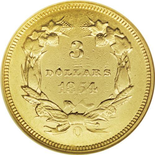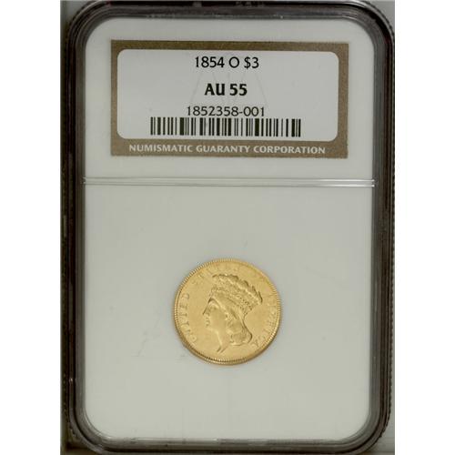 <B>1854-O $3 AU55 NGC.</B></I> As the only three dollar gold piece from the New Orleans Mint, this issue has many collectors who chase a severely limited supply, likely no more than 500 pieces, according to Winter. This Choice AU piece has light wear on the highpoints, which are softly struck as expected for the majority of this issue. Evidence of die lapping is prevalent on the reverse; this includes the ribbon, the left side of which is strong, while the right side is weak. The radiant yellow-gold surfaces have a hint of honey-gold on each side. An important piece that warrants personal inspection.<BR><BR><b>Shipping:</b> Coin/Currency (<a target="_blank" href="http://www.heritageauctions.com/common/shipping.php">view shipping information</a>)