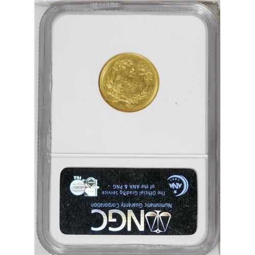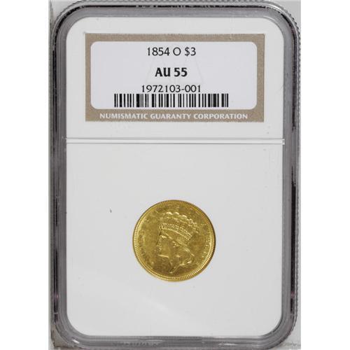 <B>1854-O<$3> AU55 NGC.</B></I> Breen-6349. This example boasts still-lustrous honey-gold surfaces that reveal few abrasions, even under a loupe, save for a small scrape from the front of the headdress to between TA in STATES. Portions of the bowknot, the right bow ribbon, and the leaf to the left of the date are effaced because of zealous die lapping. A couple of light die cracks traverse the bold O mintmark and the right ribbon nearby. The 5 in the date is fairly weak. Taken all together, however, the eye appeal is considerable on this nice Choice AU example.